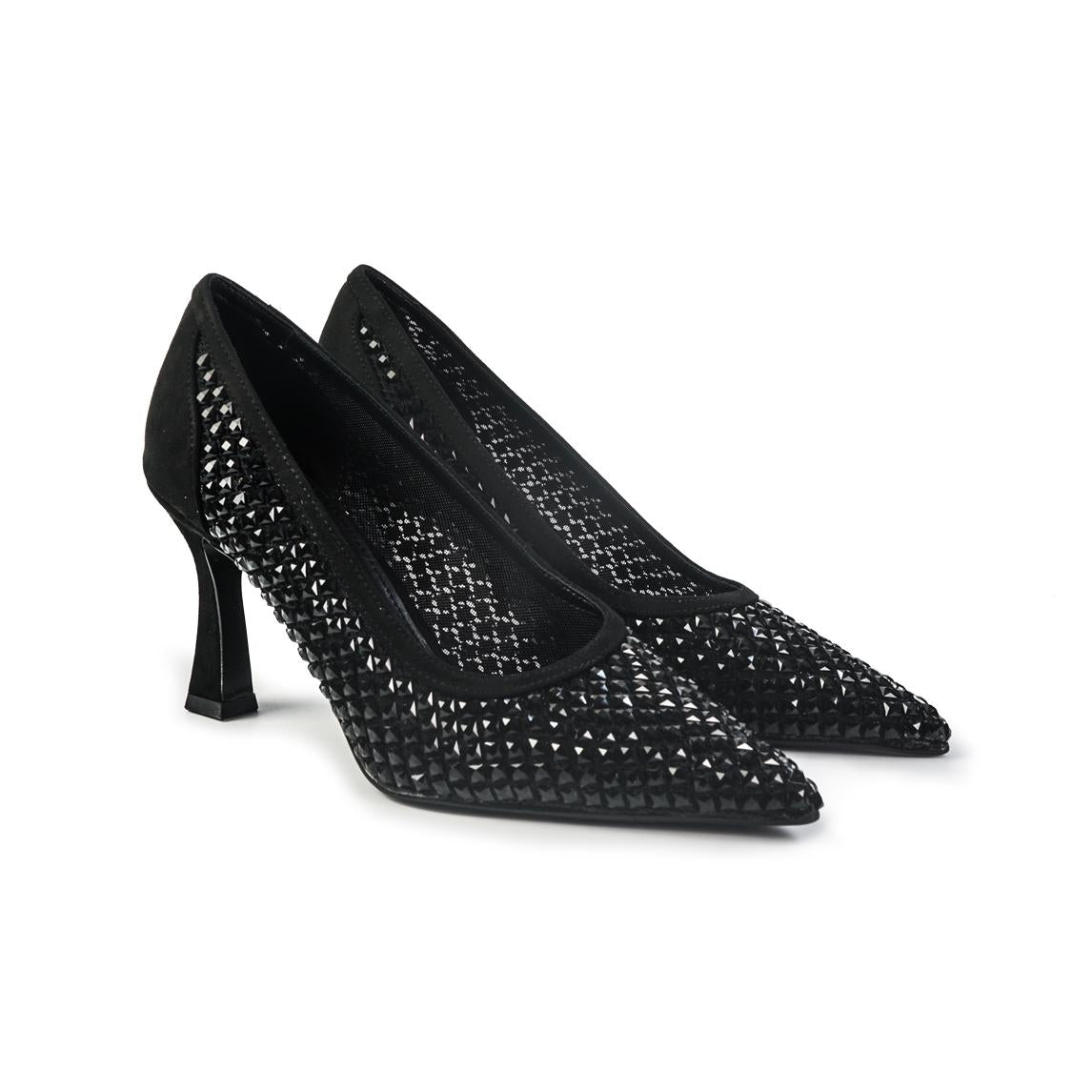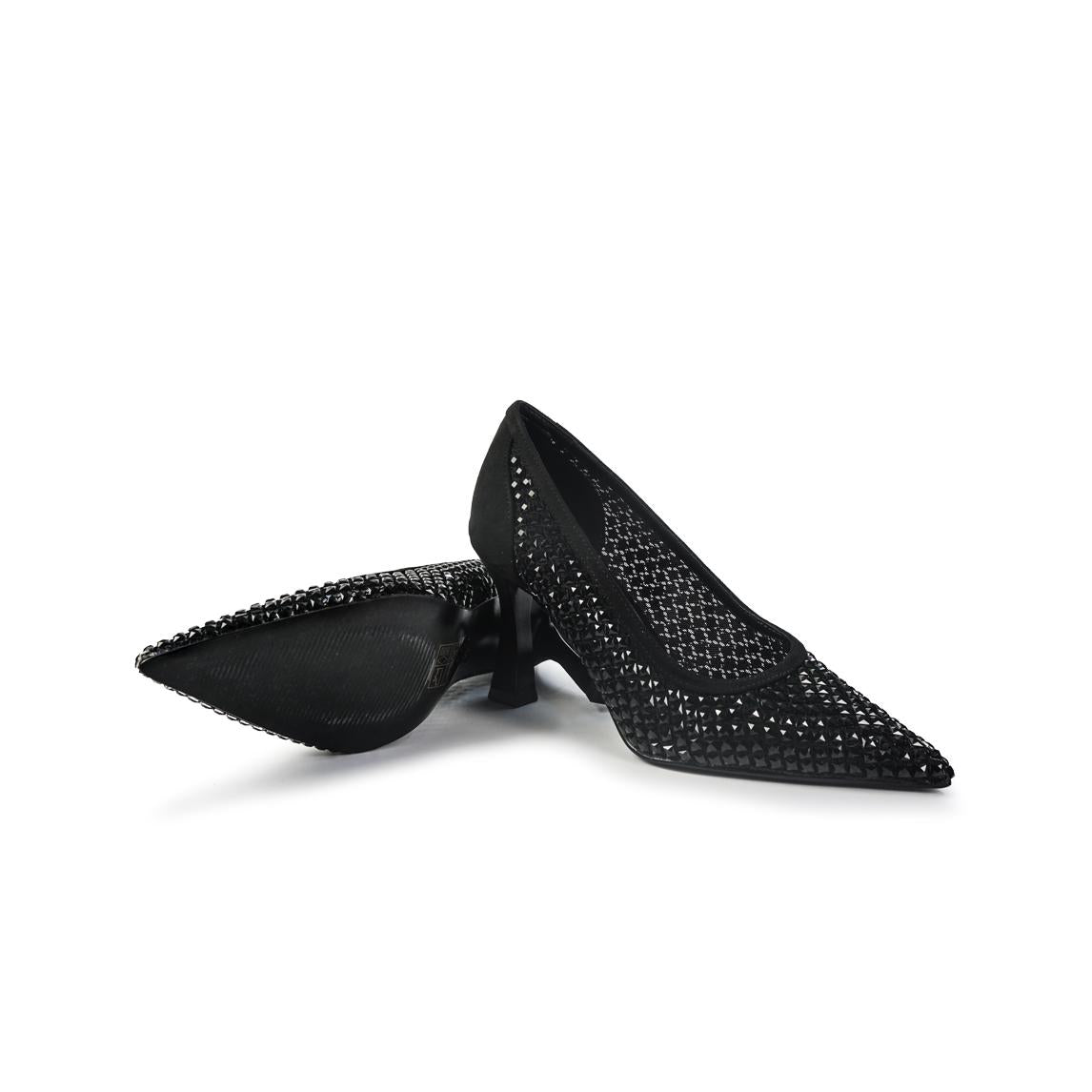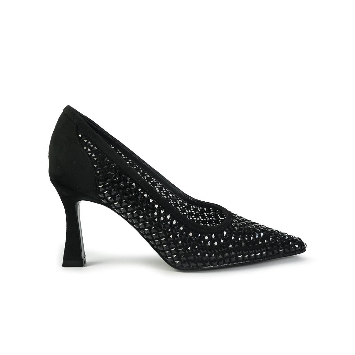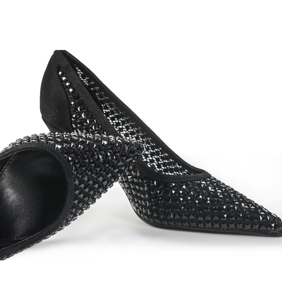 Decollete gioiello in tessuto con pietre in tinta forma a punta e tacco fasciato. Fondo gomma flessibile e antiscivolo.