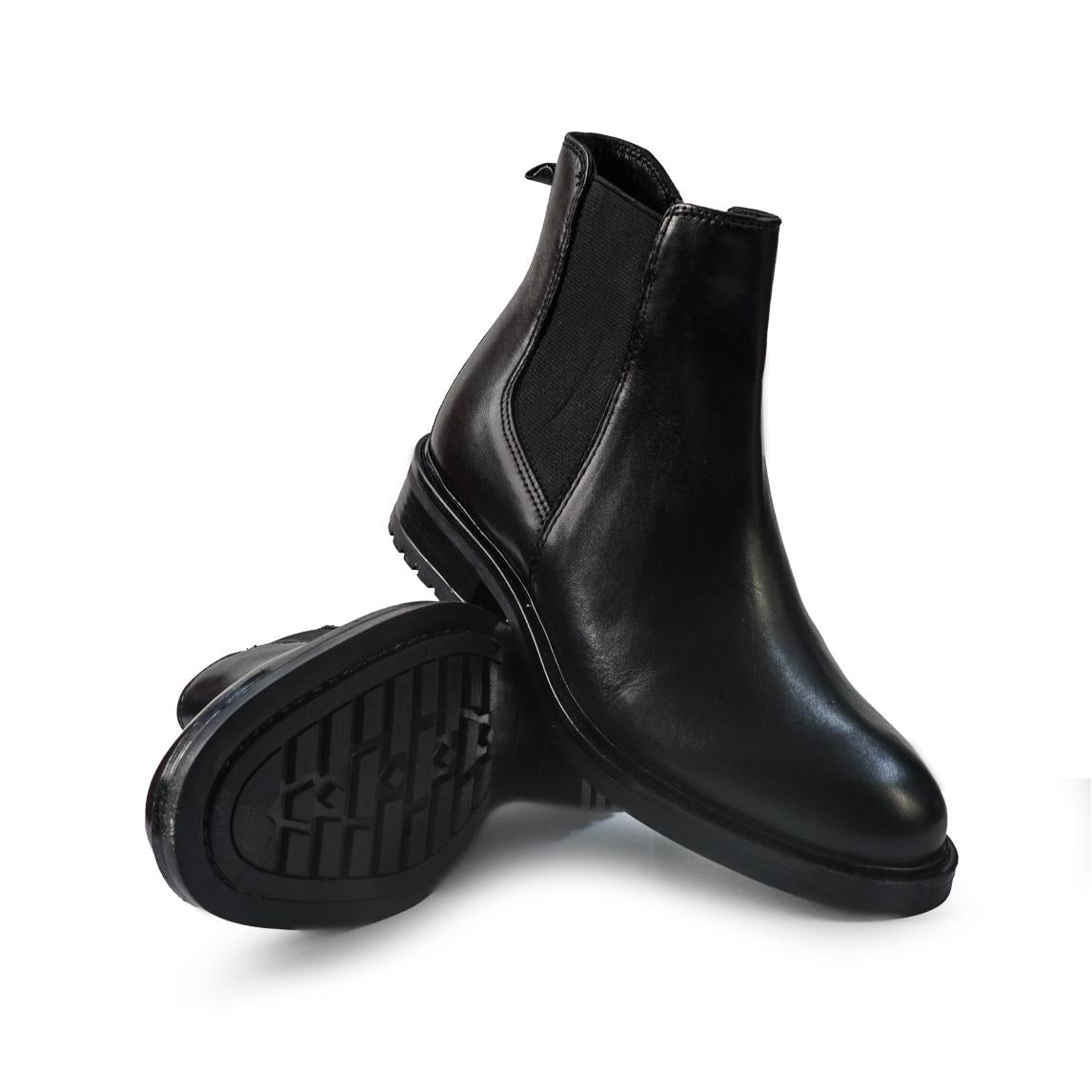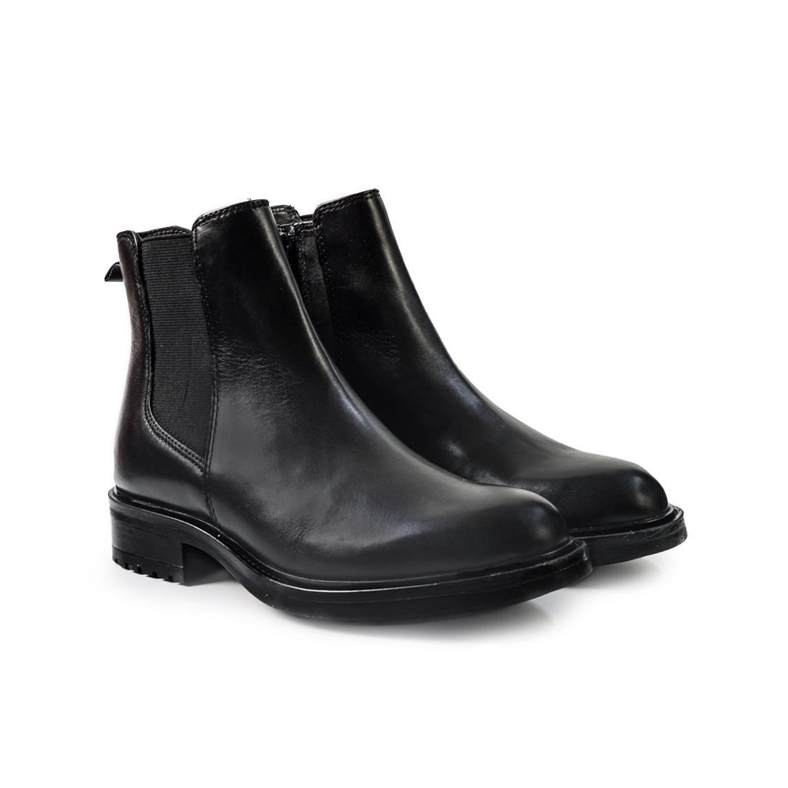 Stivaletto da donna con tacco in pelle nera con elastico esterno piede e zip interna. Fondo gomma leggero flessibile e antiscivolo.