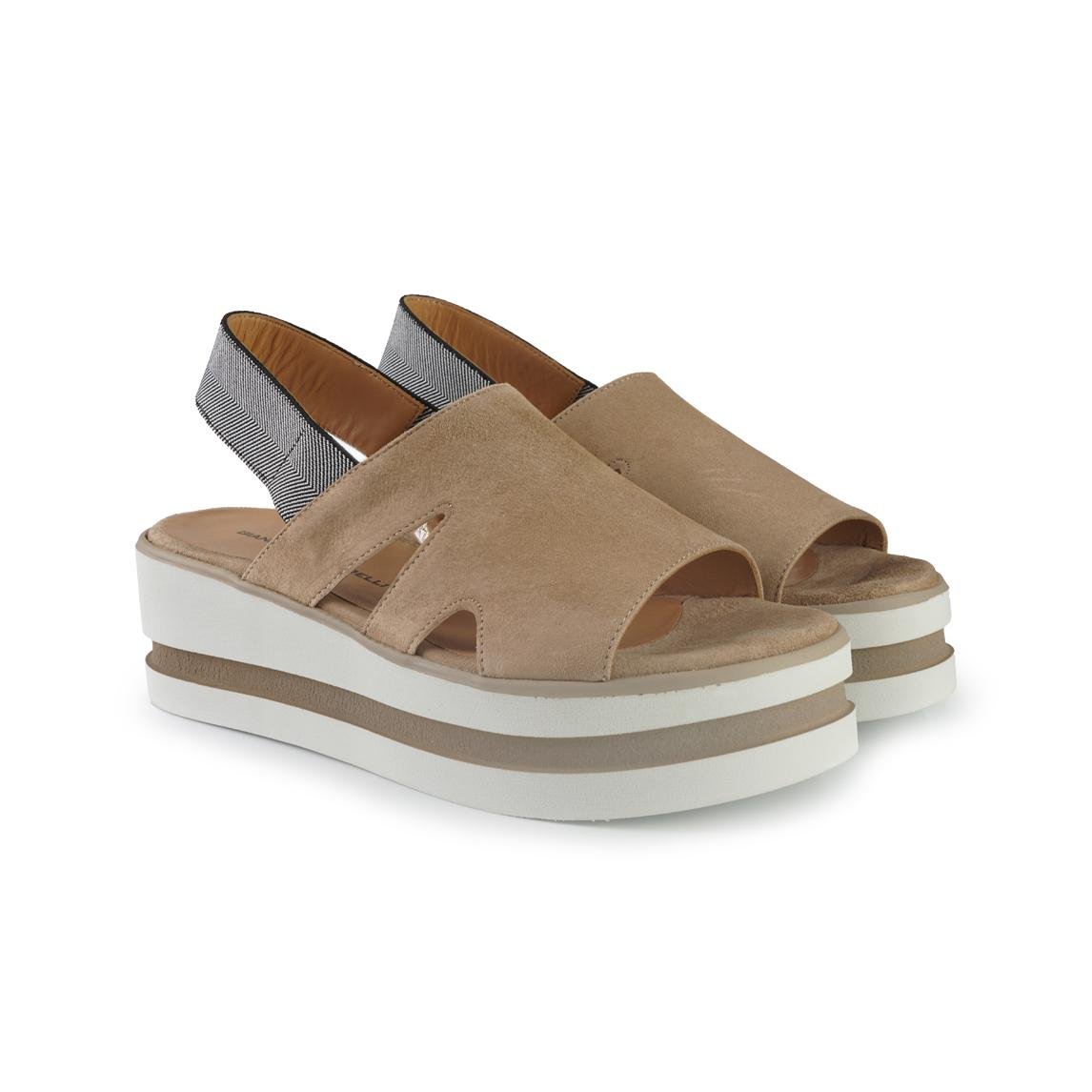 Sandalo in pelle scamosciata con zeppa bicolore. Elastico al tallone e fondo antiscivolo.