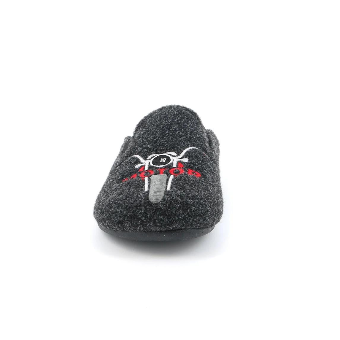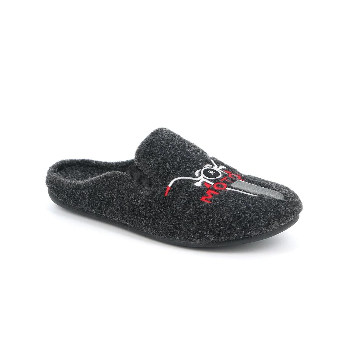 Warm, comfortable and fun felt slipper with Moto patterned embroidery. Non-slip rubber bottom.