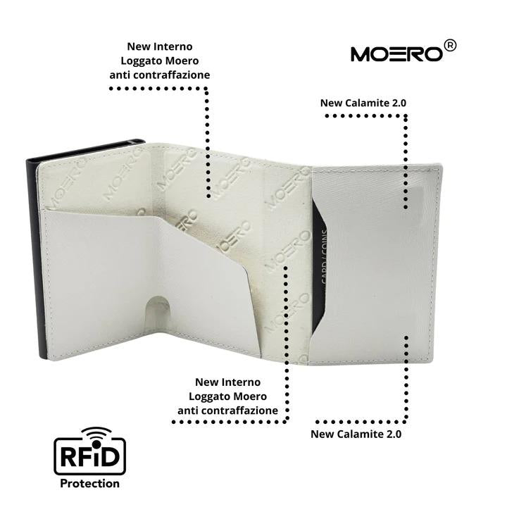 Moero è molto di più di un semplice portafoglio. Benchè compatto è ben organizzato in tutti i suoi pochi centimetri. Dal design ricercato e minimale, riesce a contenere banconote, monete e fino a 13 tessere come carte di credito, biglietti da visita e documenti.