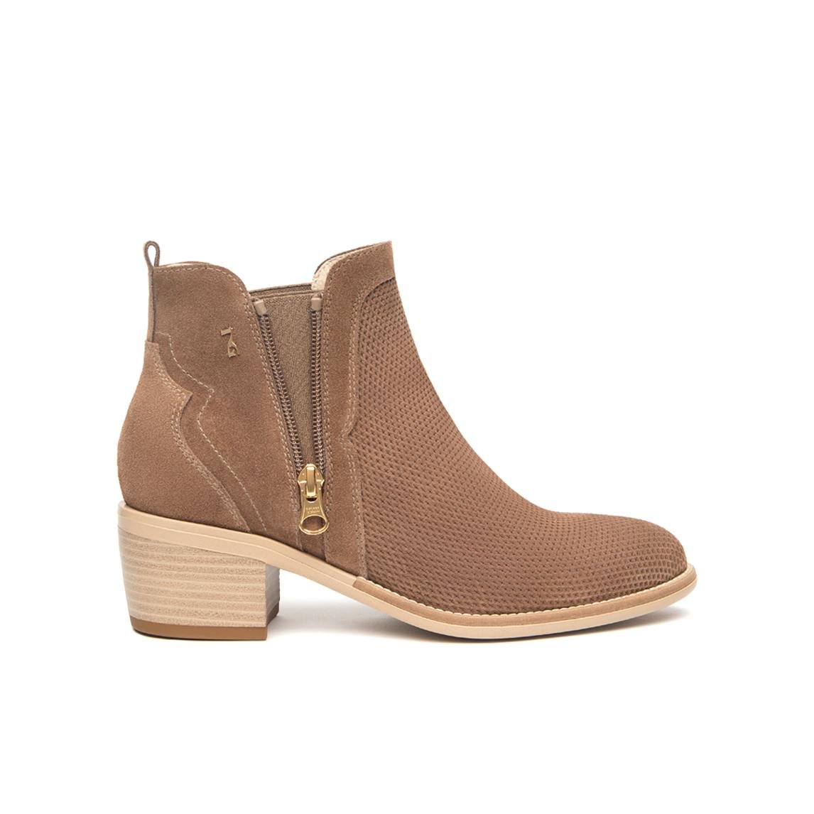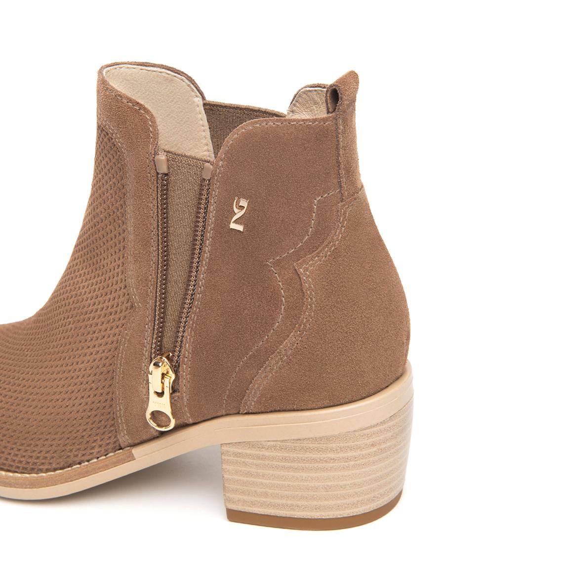 Stivaletto con elastico laterale stile Camperos in pelle scamosciata microforata con tacco fasciato cuoio e fondo flessibile e antiscivolo.