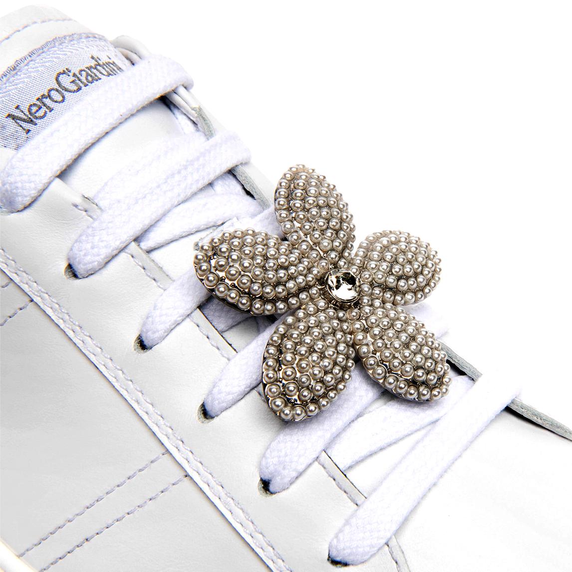 Sneakers platform con zeppa in pelle bianca e con accessori charms gioiello sui lacci. Chiusura con lacci e soletta estraibile con tecnologia DryGo!®