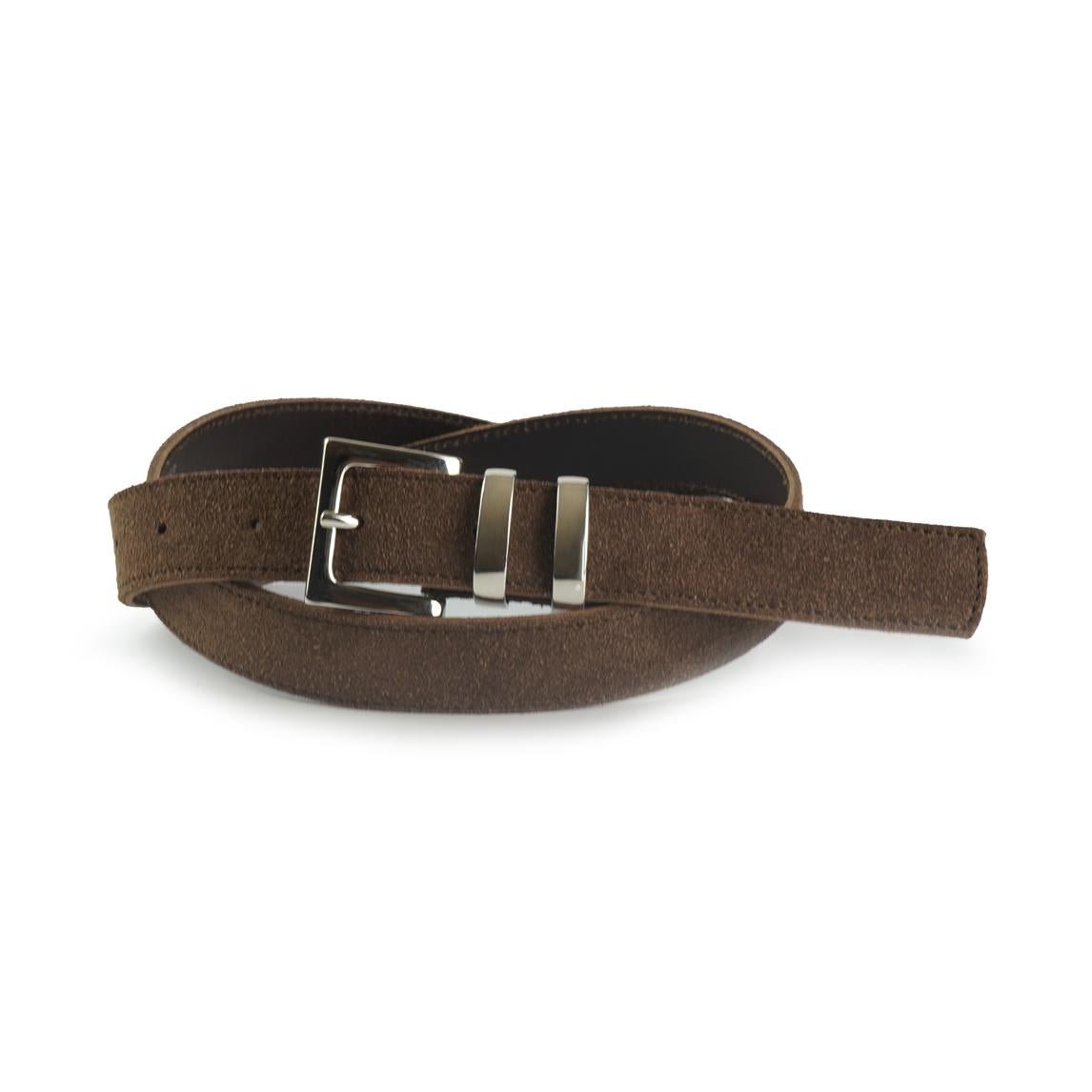 Cintura in pelle scamosciata spessore 2,5 cm con fibbia e doppio passante in metallo. La cinta è provvista di vite per eventuali regolazioni di misura.