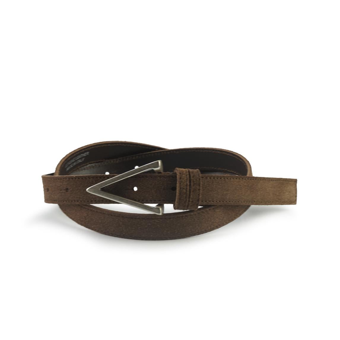 Cintura in pelle scamosciata spessore 2 cm con fibbia a chiusura con ancoraggio. La cinta è provvista di vite per eventuali regolazioni di misura.