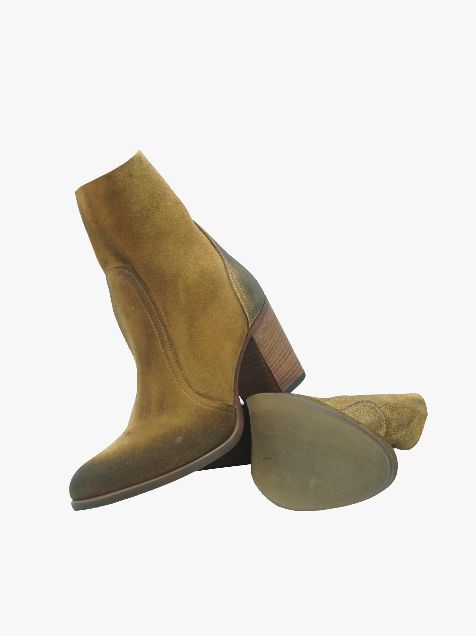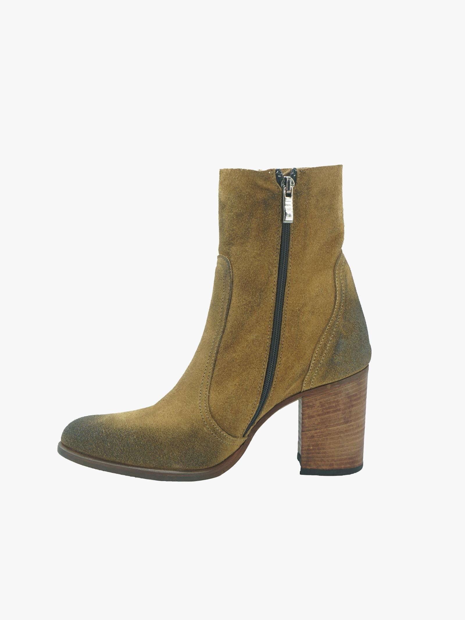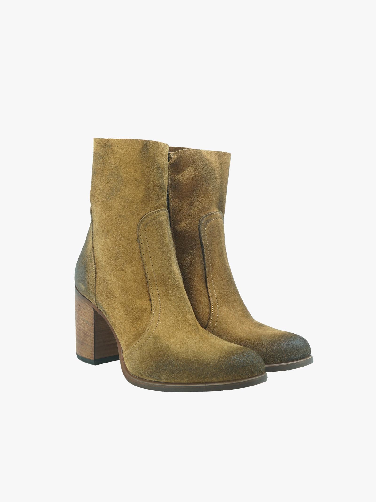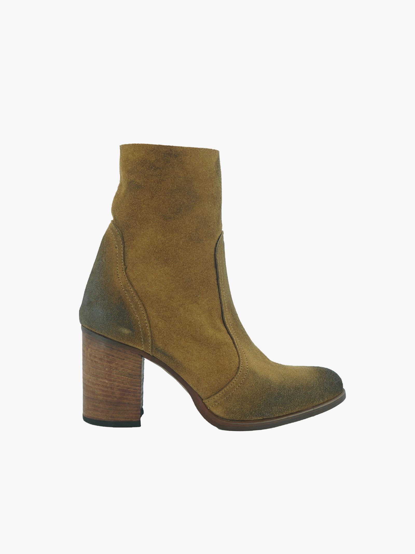 Leather ankle boot with raw cut upper. The upper and the heel have a vintage (stained) effect due to a very particular milling process which enhances their characteristics.