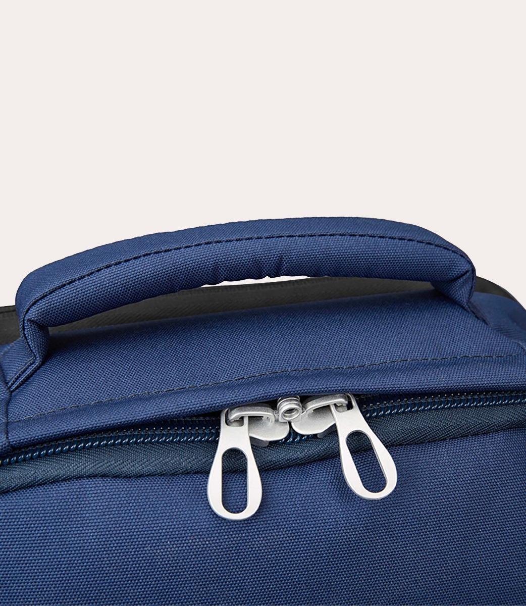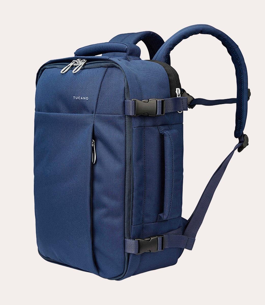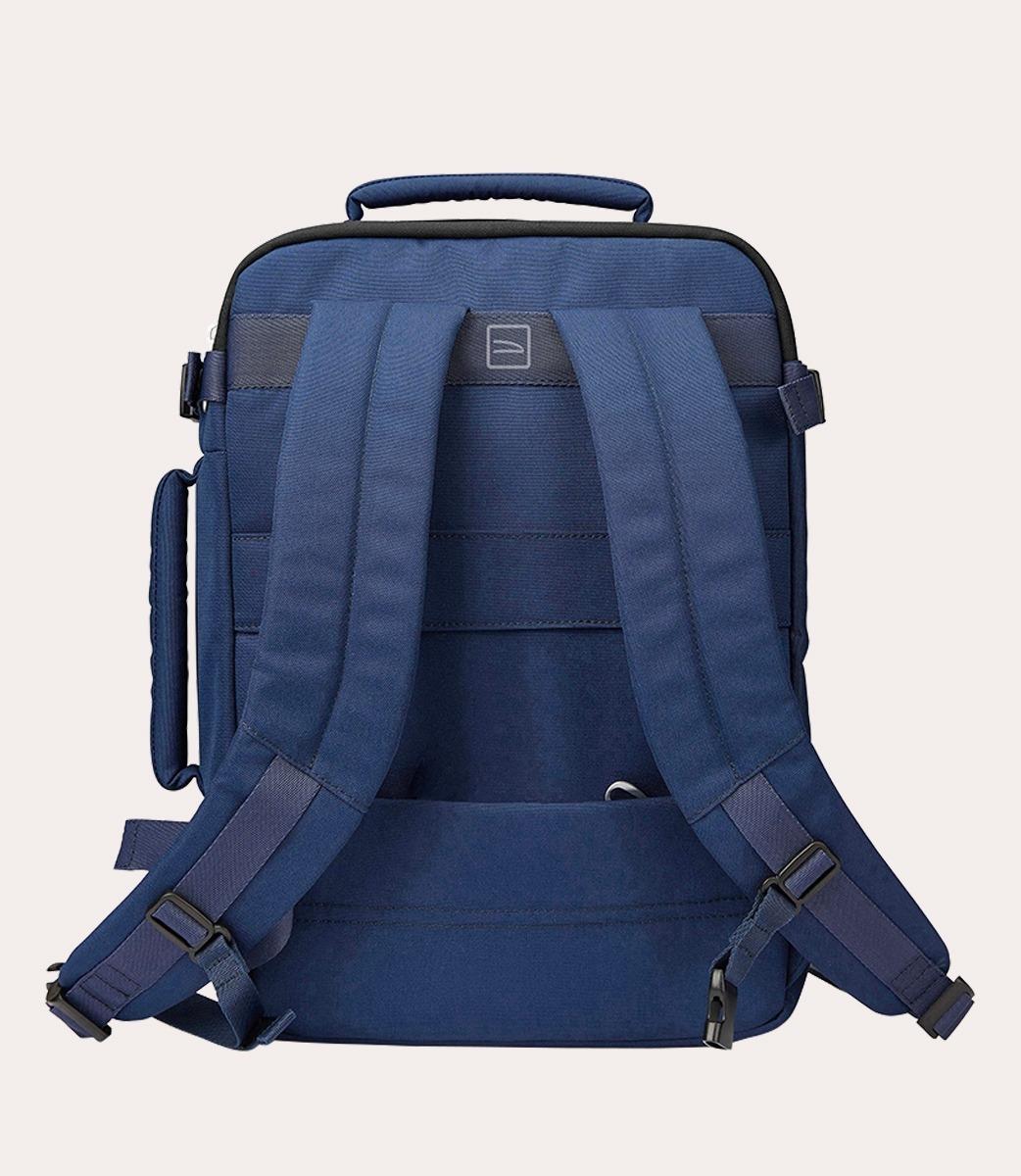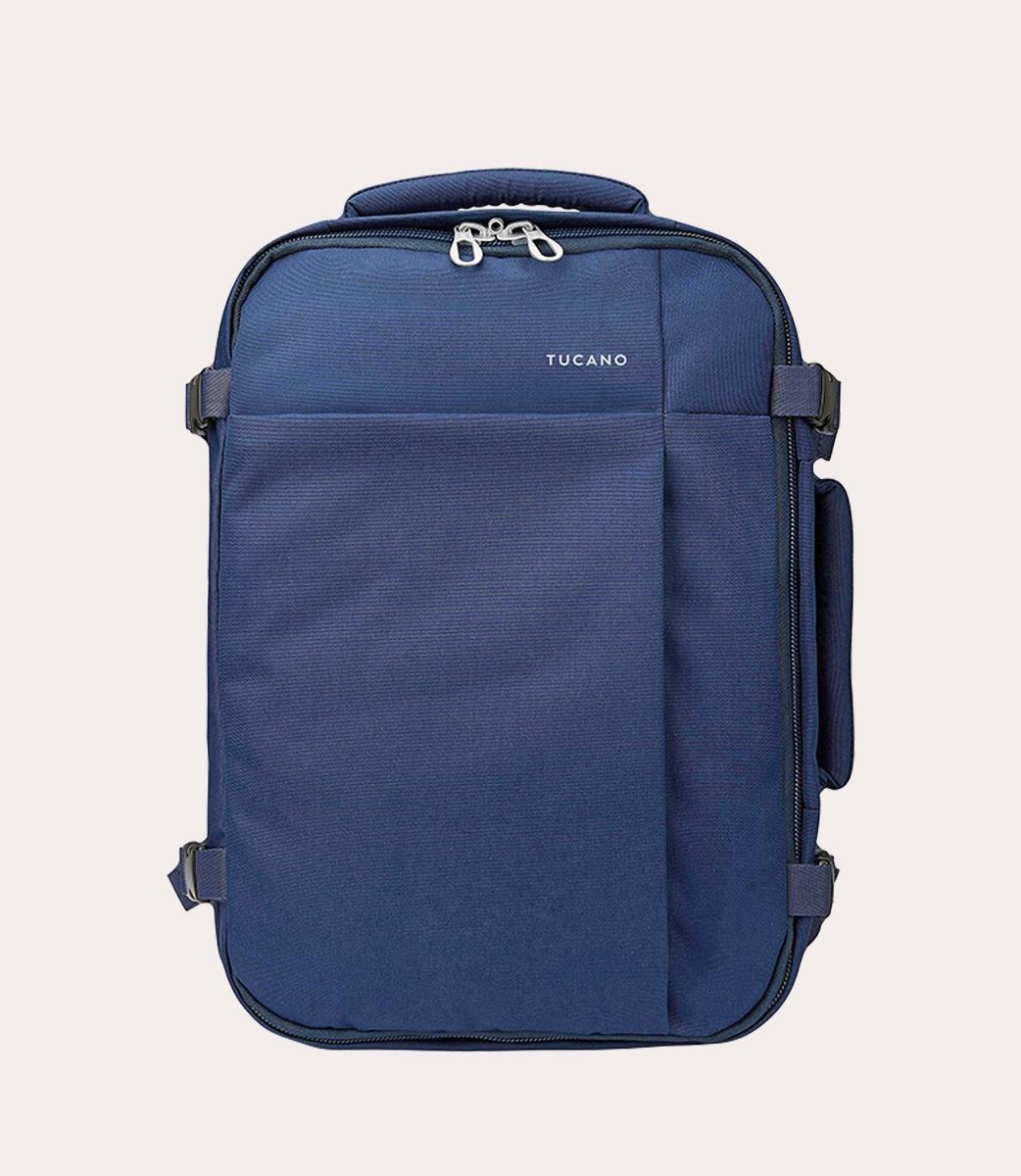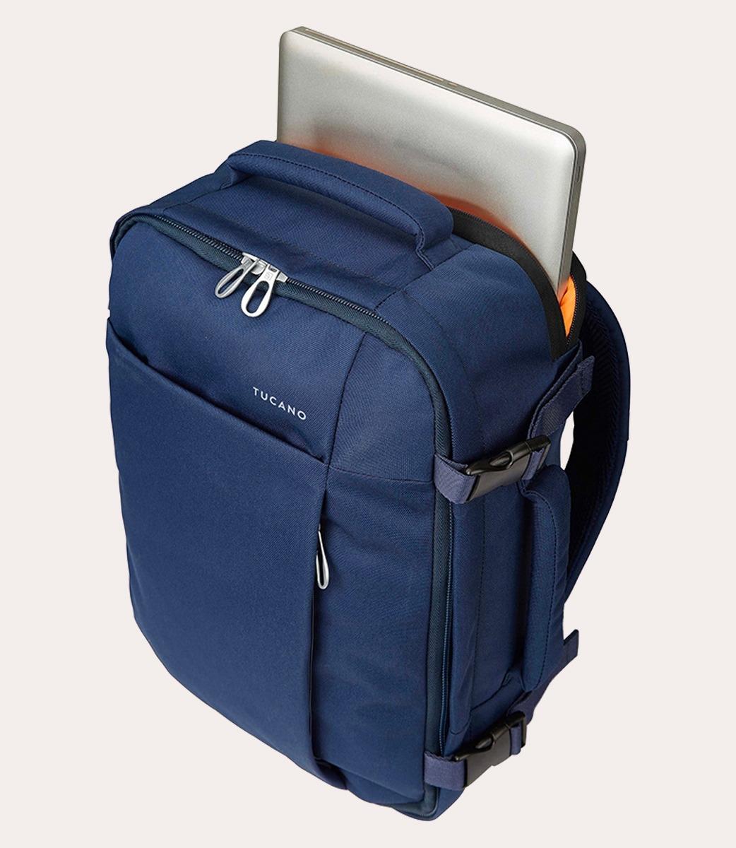 Durable backpack designed to fit the maximum dimensions allowed by airlines made of fabric obtained from recycled plastic, in terms of hand luggage (IATA). Tugò M has two comfortable pockets on the front, ideal for storing your travel accessories, and a padded rear compartment for the protection of a 15.6" laptop or a 16" MacBook Pro; this makes it possible to quickly access your laptop, also speeding up airport checks. Also on the rear panel there is a band for transport via trolley and a security pocket, useful for hiding valuable objects while keeping them safe. The main compartment boasts a capacity of over 18 liters and is perfect for placing everything you need for a weekend away. The zip pullers in the main compartment are also padlock compatible, so you can always be sure to protect your contents. To complete the features we find 4 adjustable straps on the sides of the backpack, a chest strap and two sturdy handles to help position the backpack on the overhead bins of airplanes and trains.