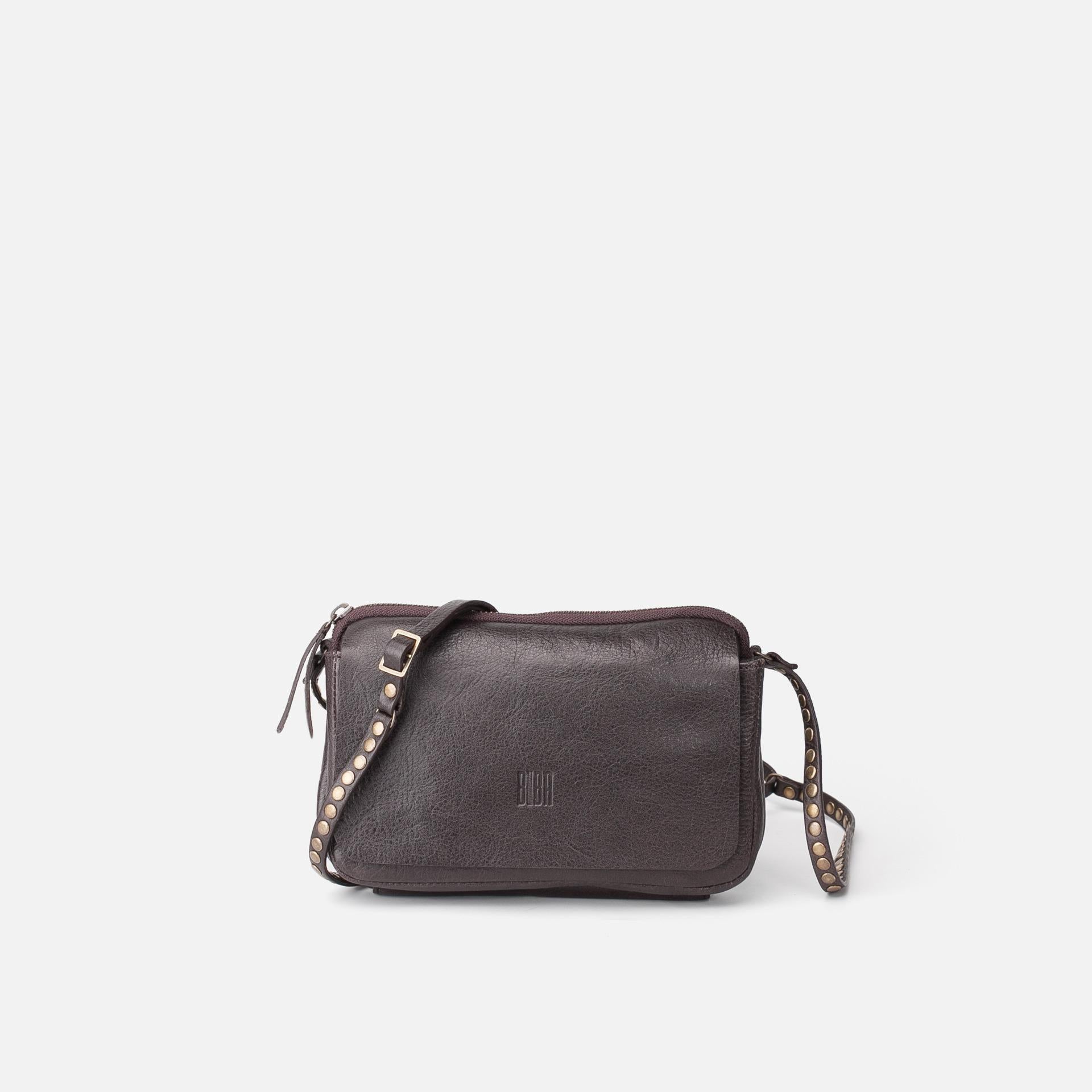 Borsa a tracolla in pelle di vacchetta, con finitura lucida ed elegante. Tracolla borchiata regolabile, chiusura con patta e cerniera, tasche esterne e interne e fodera in cotone.