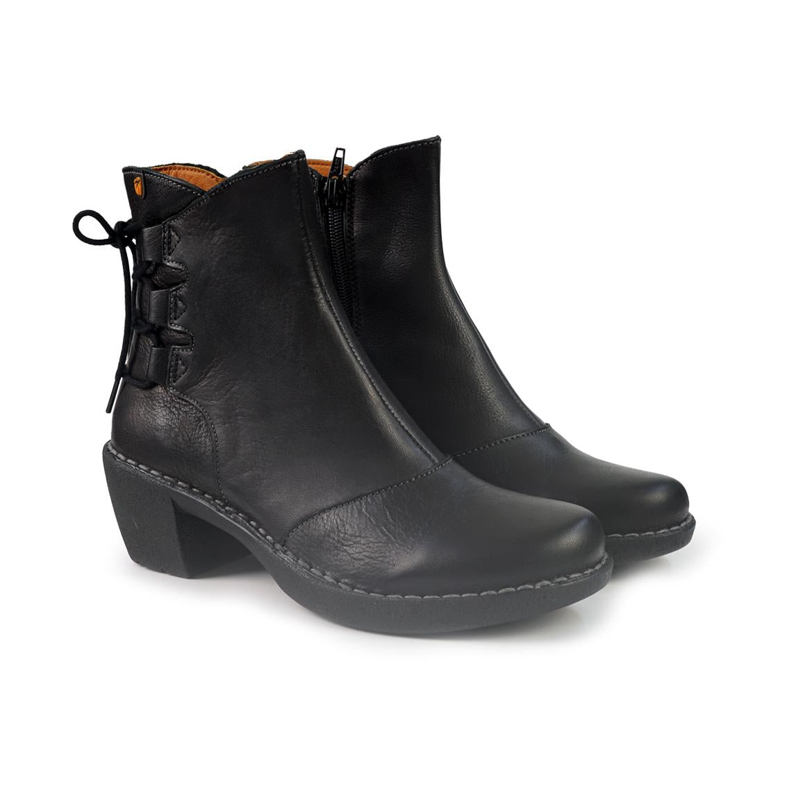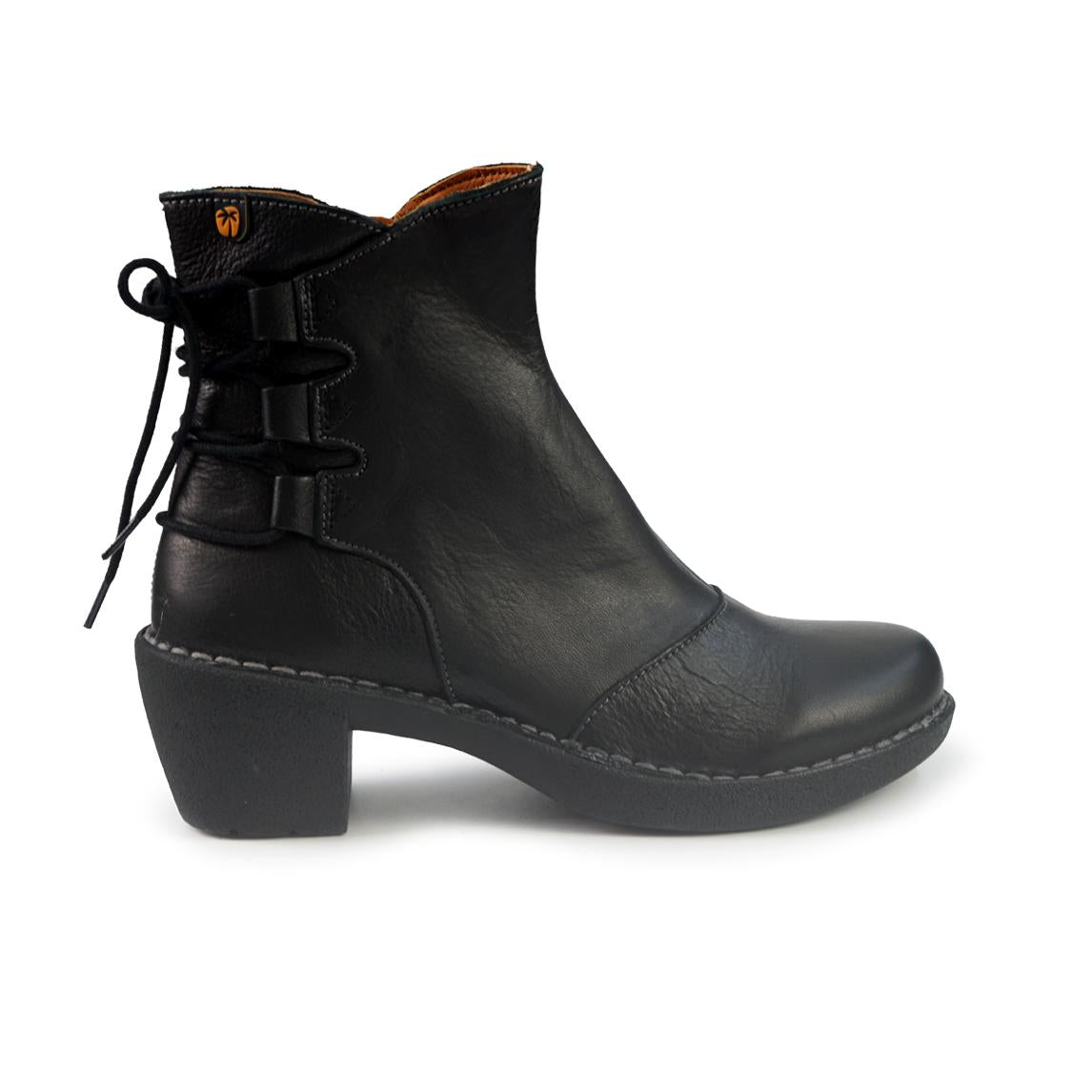 Stivaletto in pelle con chiusura interna zip e laccio accessorio al tallone. Fondo comma antiscivolo.