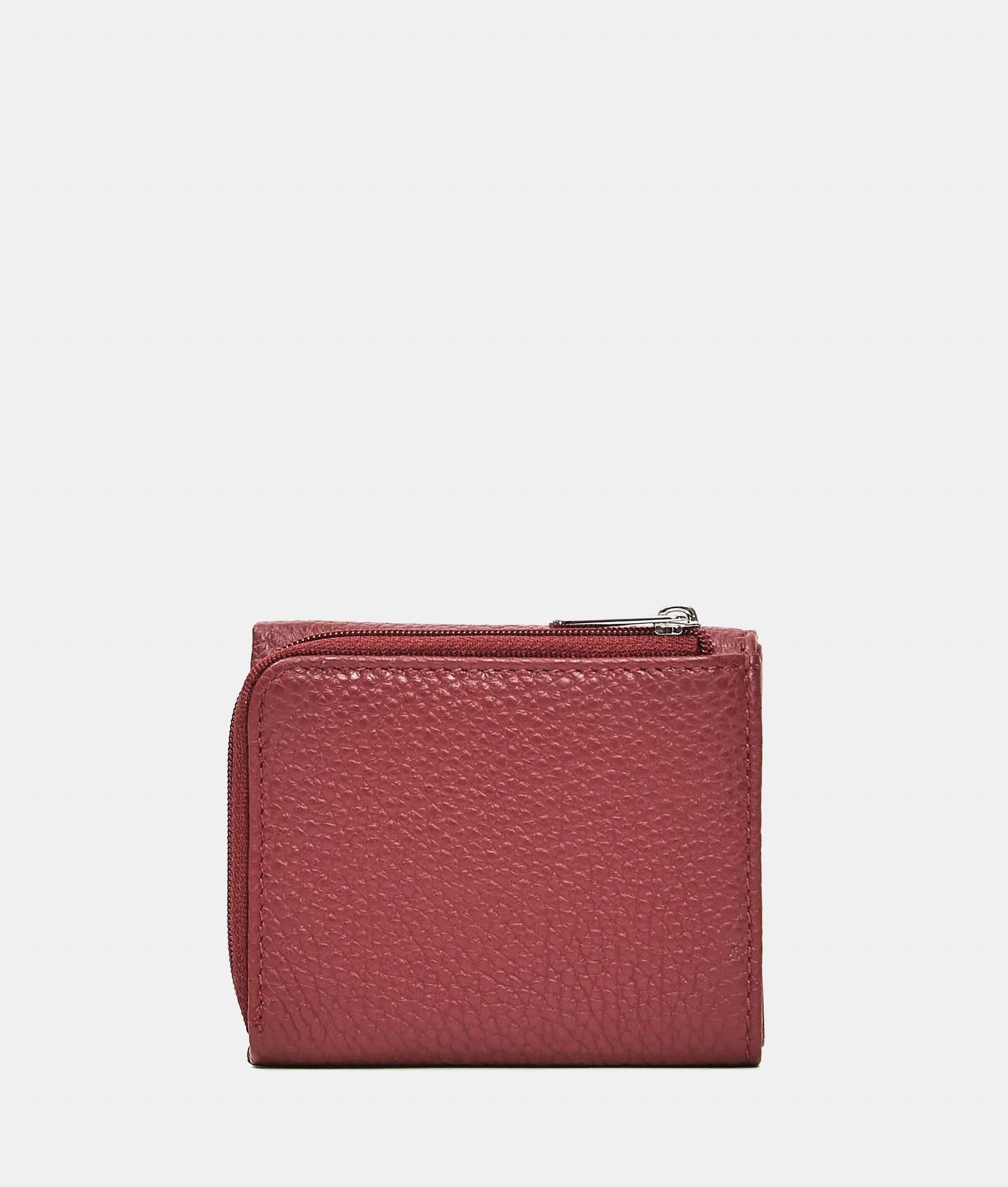 Portafoglio in pelle compatto con zip e chiusura con bottone a pressione. Dotato di porta tessere porta monete e banconote. Arricchito da logo metallico frontale.