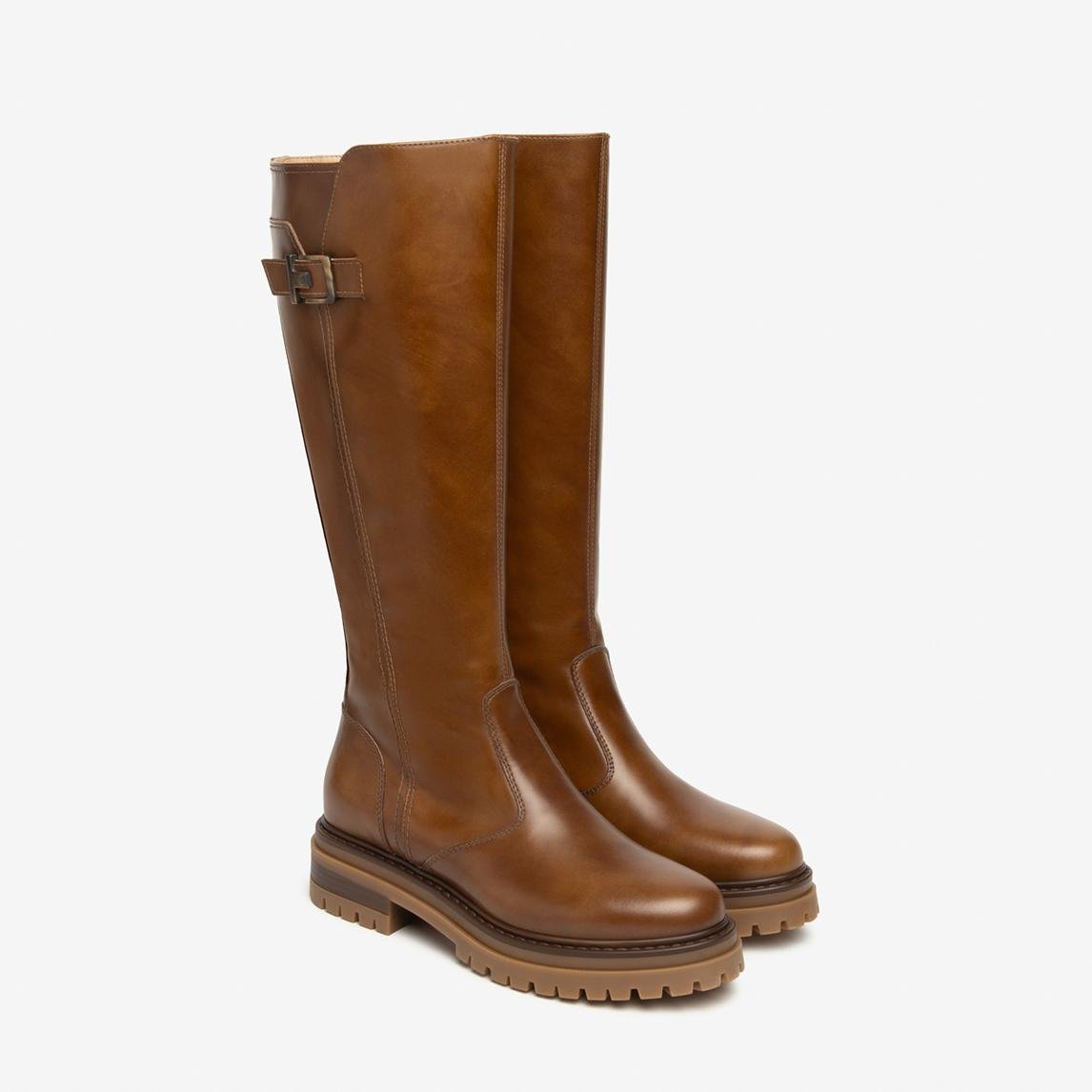 Stivale anfibio da donna in pelle cuoio con doppia chiusura zip e logo in metallo.