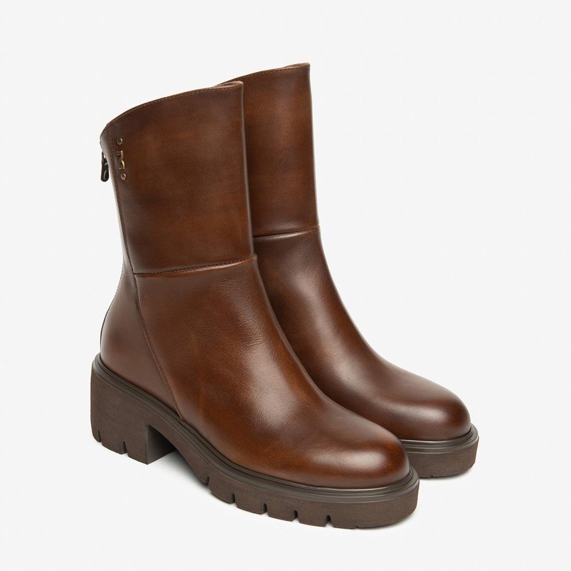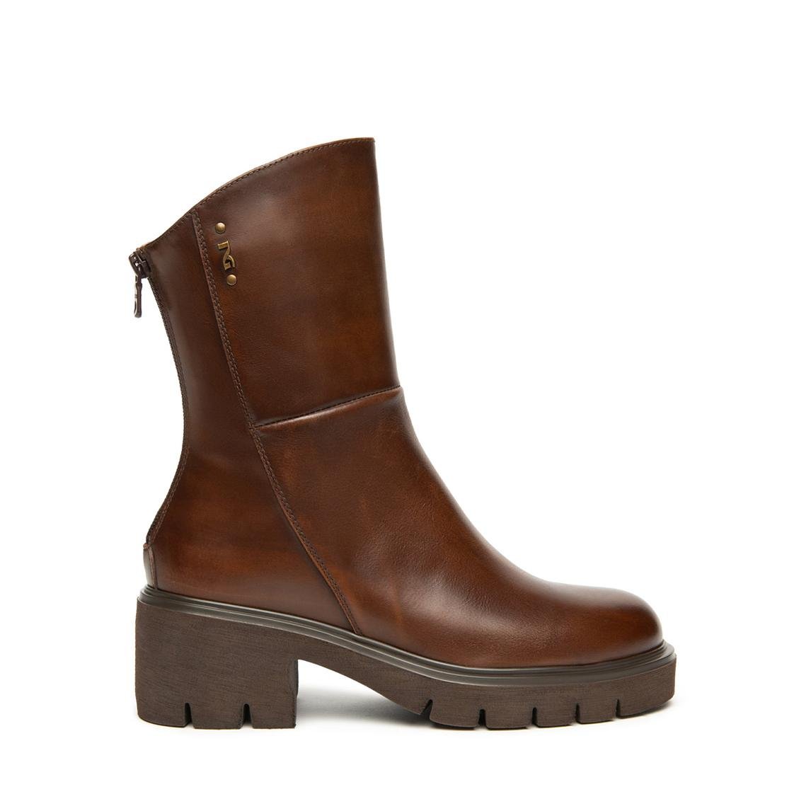 Stivaletto chunky in pelle con tacco largo e gambale a taglio svasato.