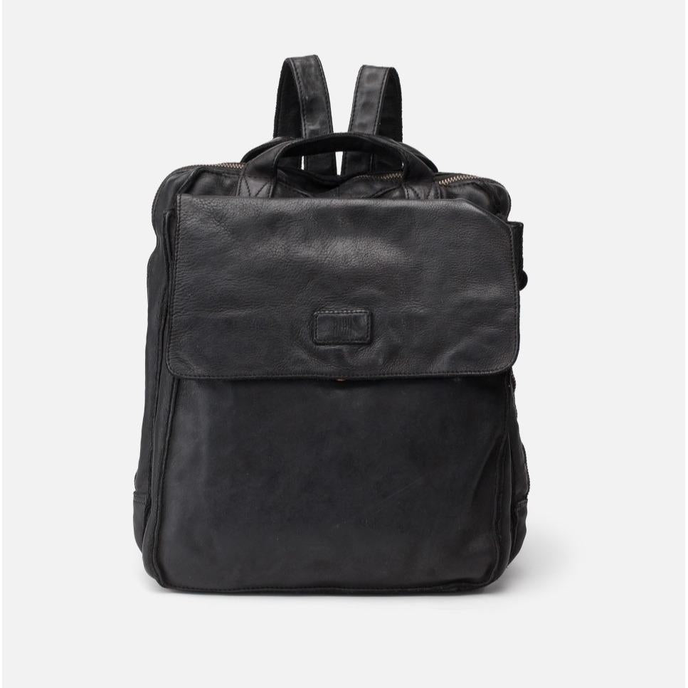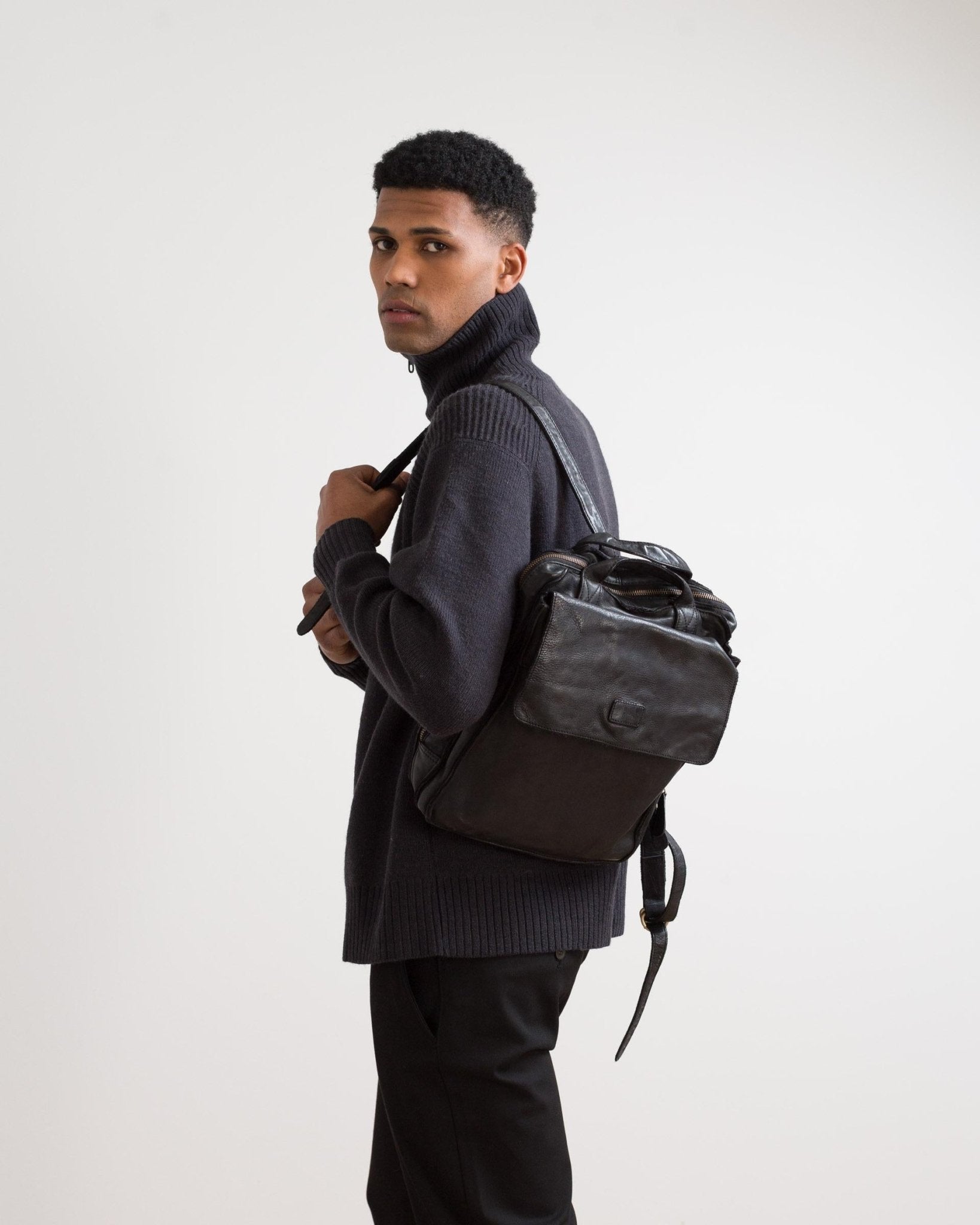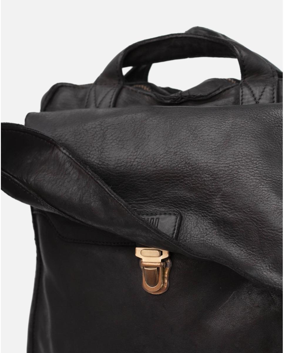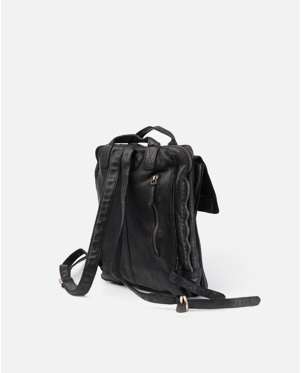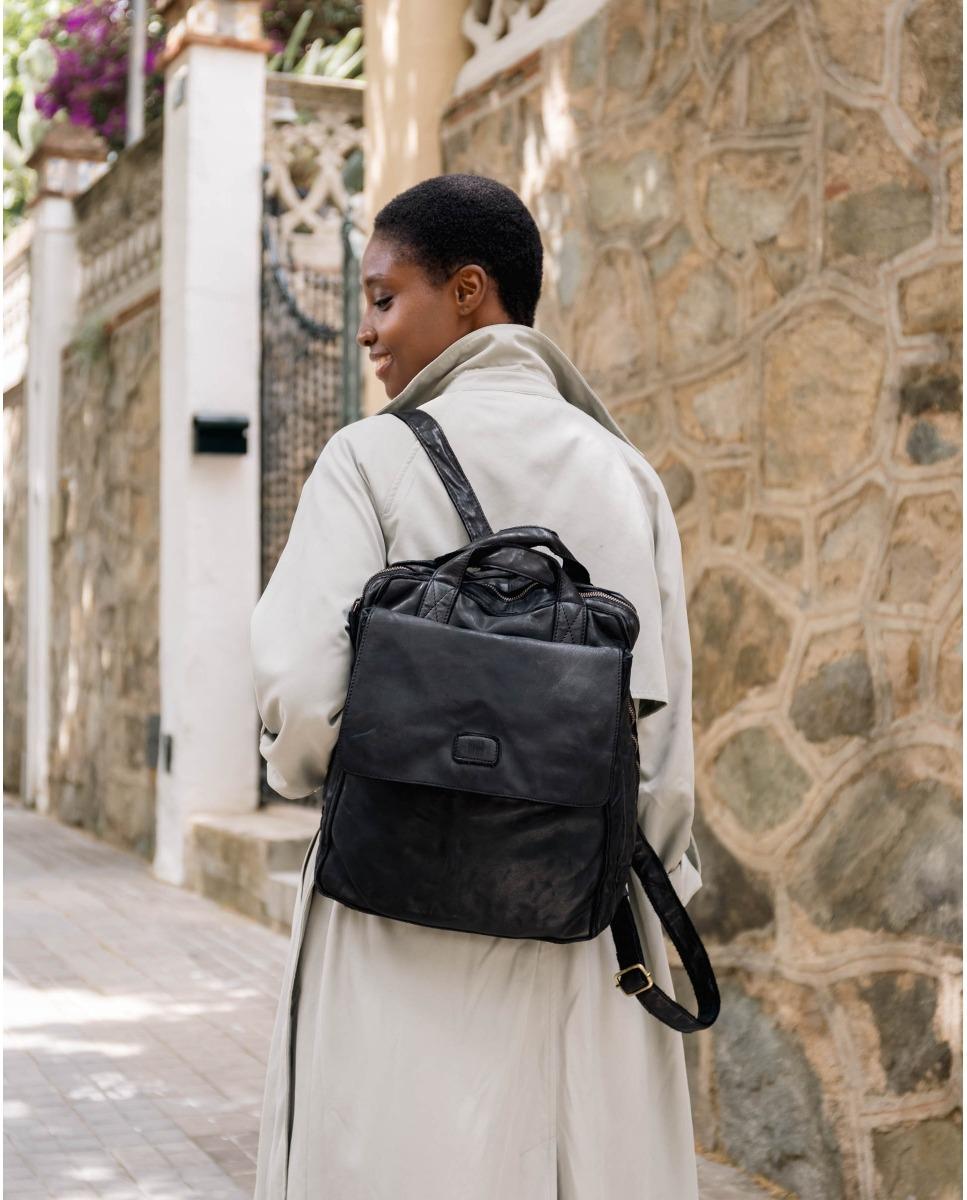 • Zaino in pelle di vacchetta lavata. Patta con chiusura a scatto in metallo. Scomparto principale con ampia apertura e chiusura a cerniera.
