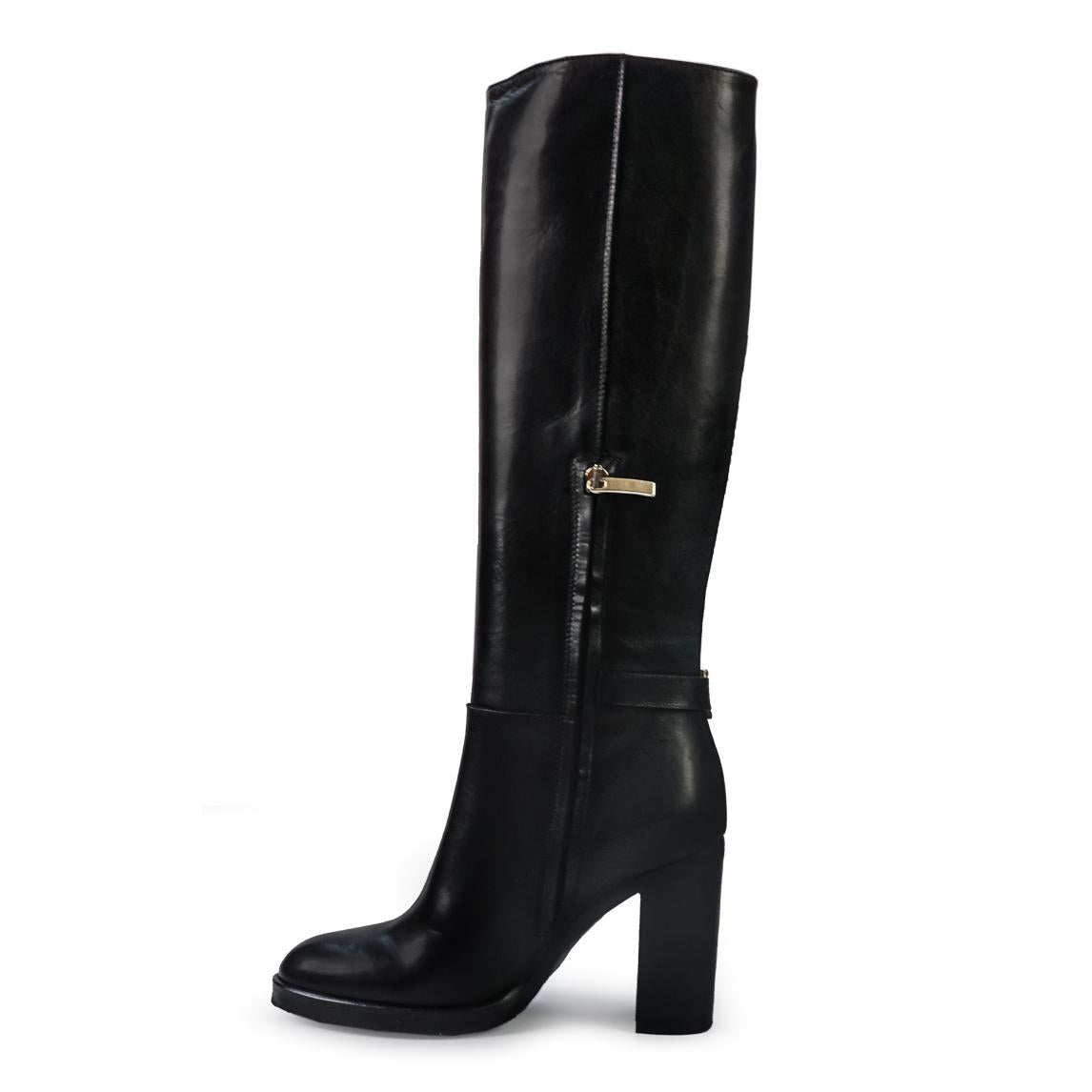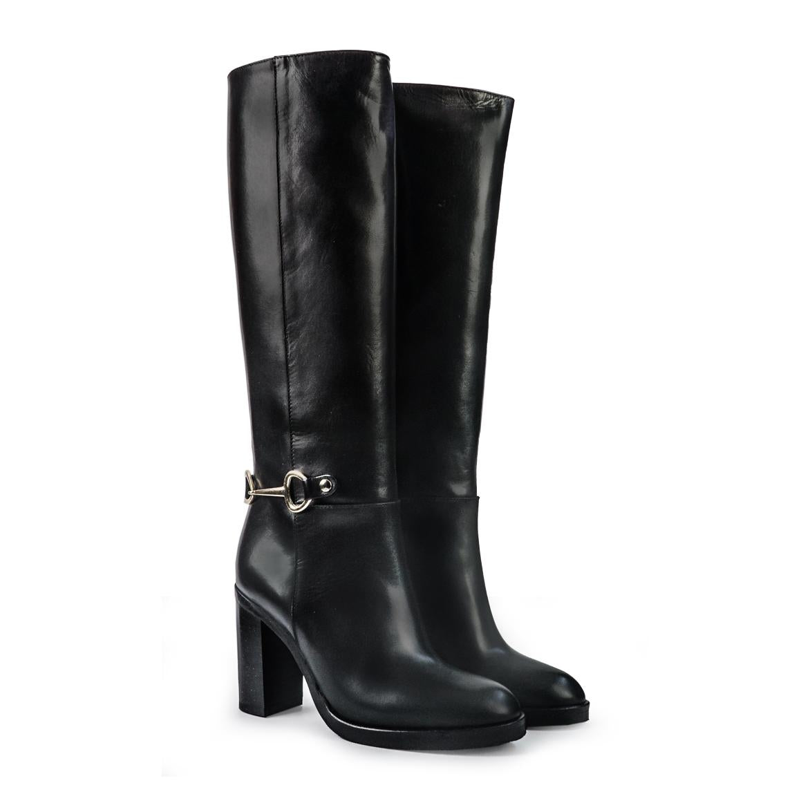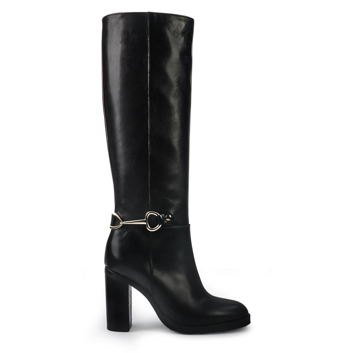 Stivale da donna Gianni Crasto in pelle nera, con accessorio morsetto effetto sperone alla caviglia e tacco alto fasciato cuoio. Dotato di mezza zip laterale per una calzata pratica e confortevole. Fondo cuoio e intersuola gomma.