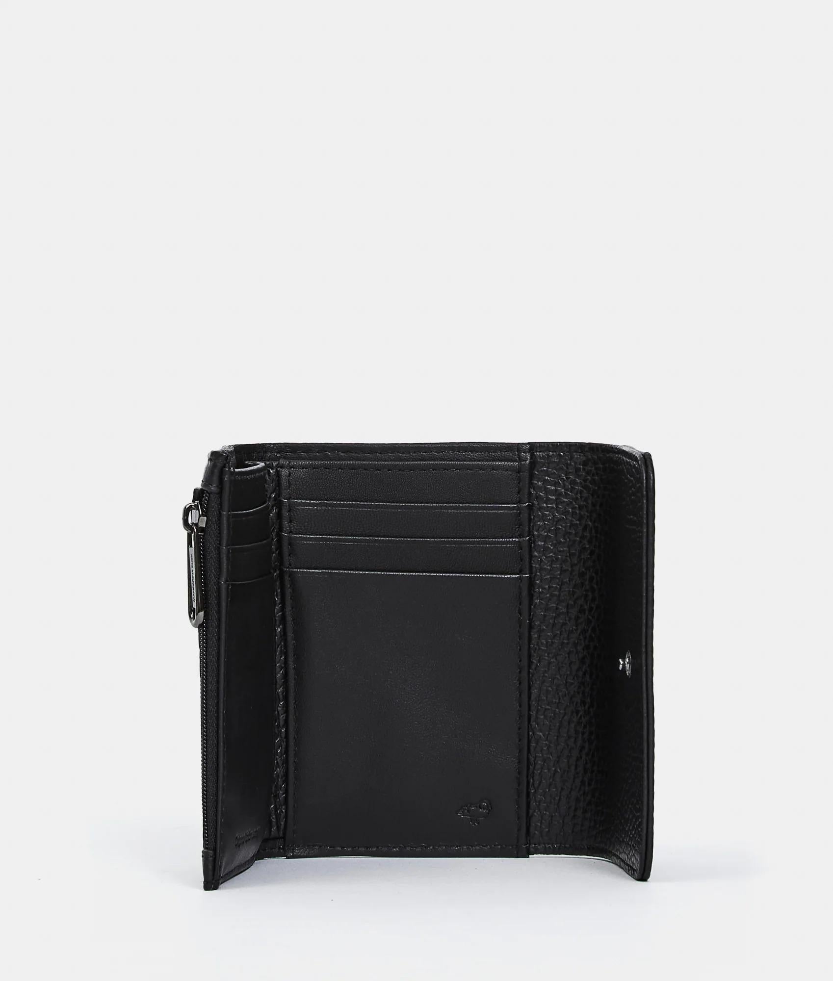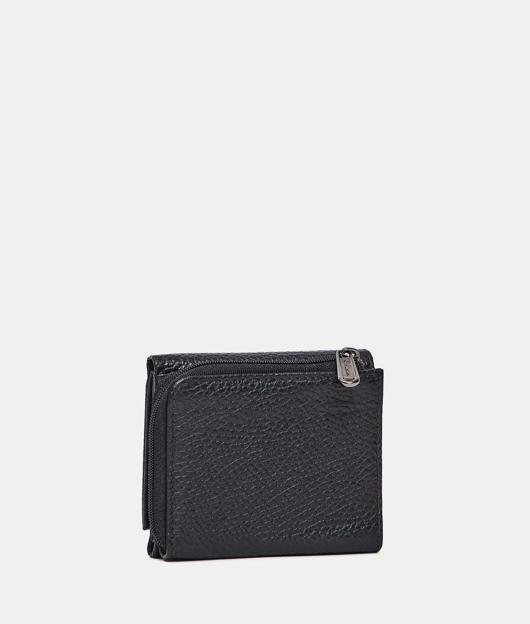 Portafoglio in pelle compatto con zip e chiusura con bottone a pressione. Dotato di porta tessere porta monete e banconote. Arricchito da logo metallico frontale.