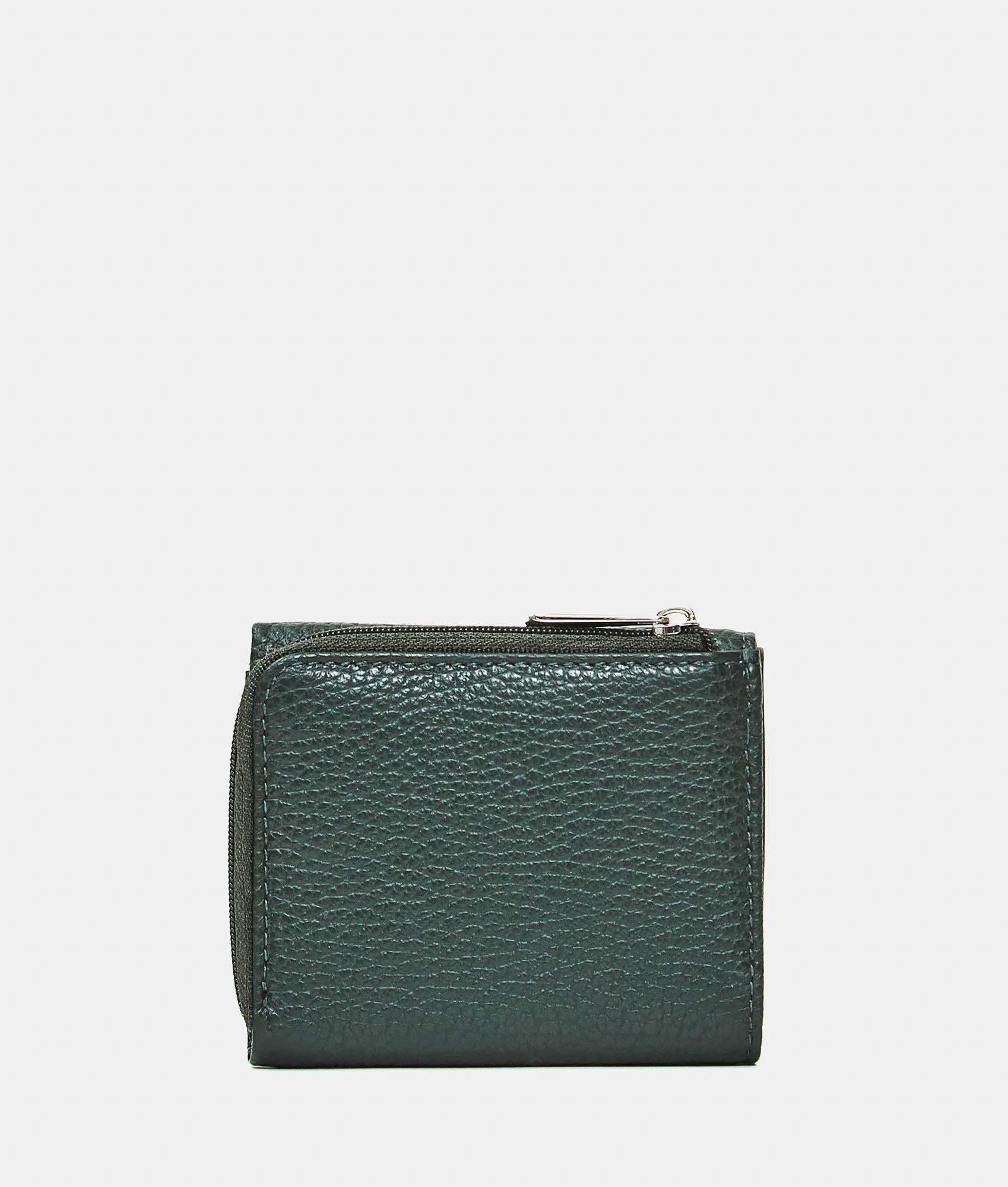 Portafoglio in pelle compatto con zip e chiusura con bottone a pressione. Dotato di porta tessere porta monete e banconote. Arricchito da logo metallico frontale.