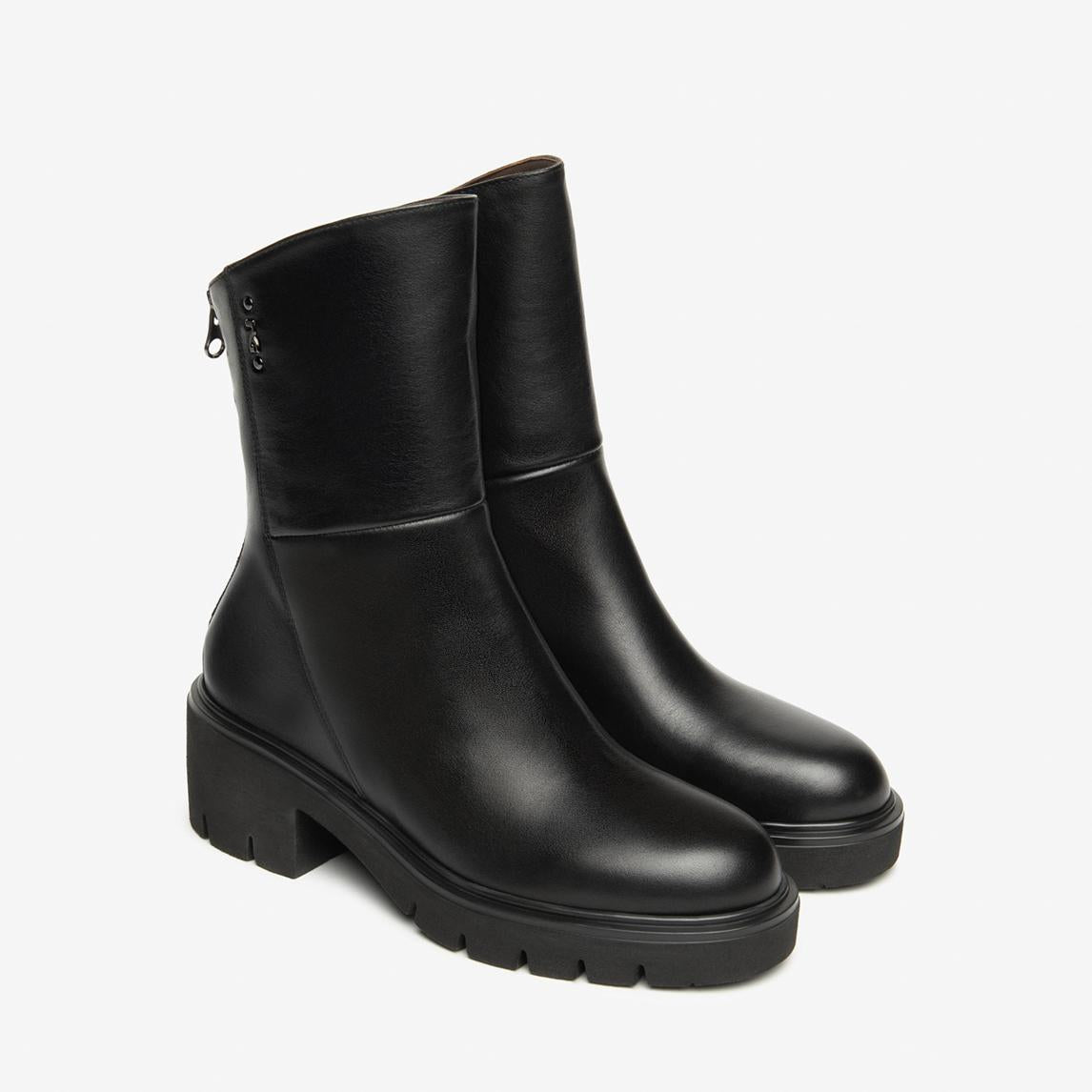 L'essenza del Made in Italy in un classico contemporaneo. Realizzato in vera pelle nera, questo stivaletto con tacco chunky e chiusura zip al tallone, è progettato per la donna che non rinuncia all'altezza, ma esige stabilità e comfort in ogni occasione. Un capo passe-partout versatile che aggiunge un tocco di grinta e sofisticatezza a qualsiasi outfit, dal denim all'abito elegante.