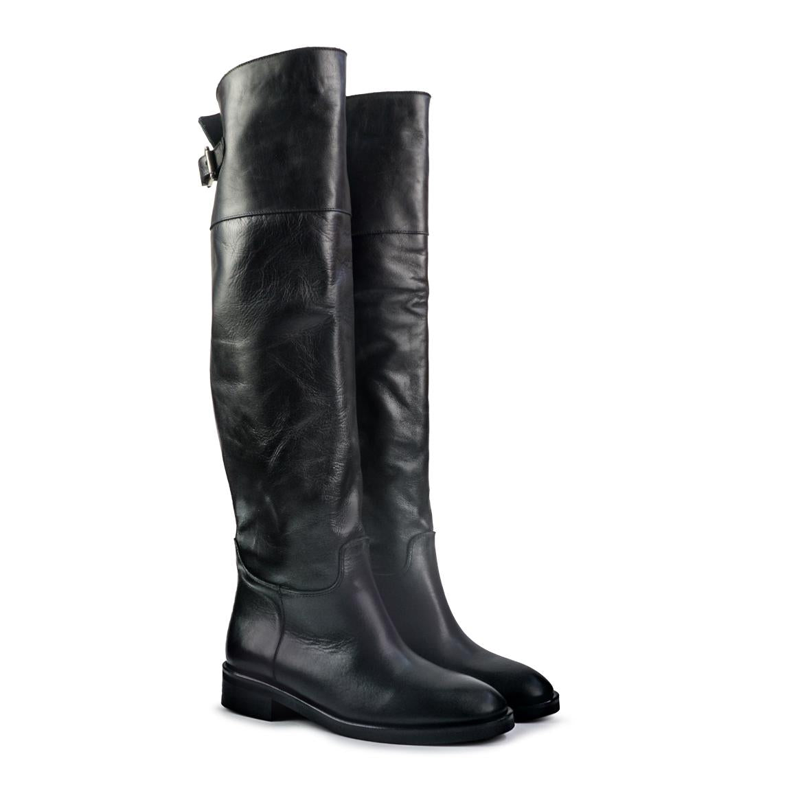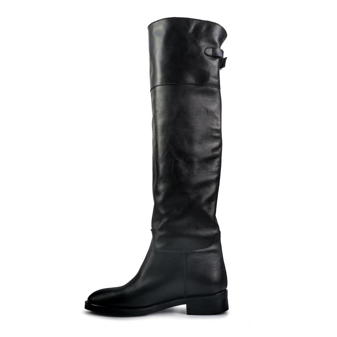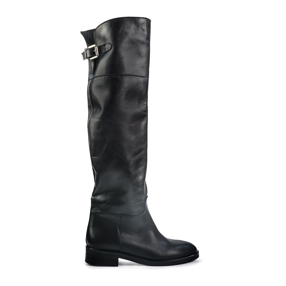 Stivale al ginocchio tubolare a tacco basso fasciato in pelle. Fibbia regolabile al polpaccio e fondo gomma flessibile e antiscivolo.