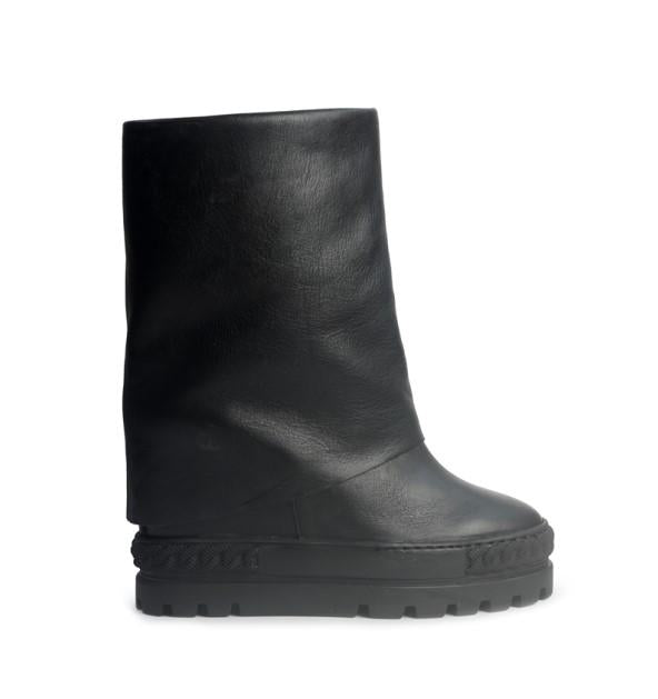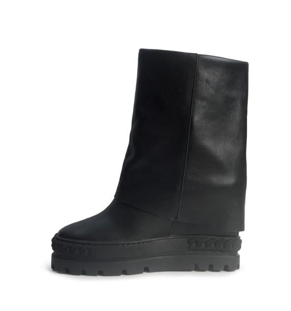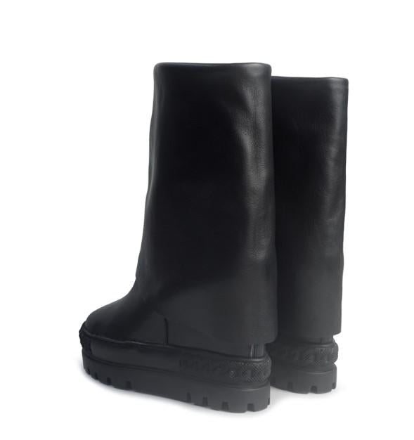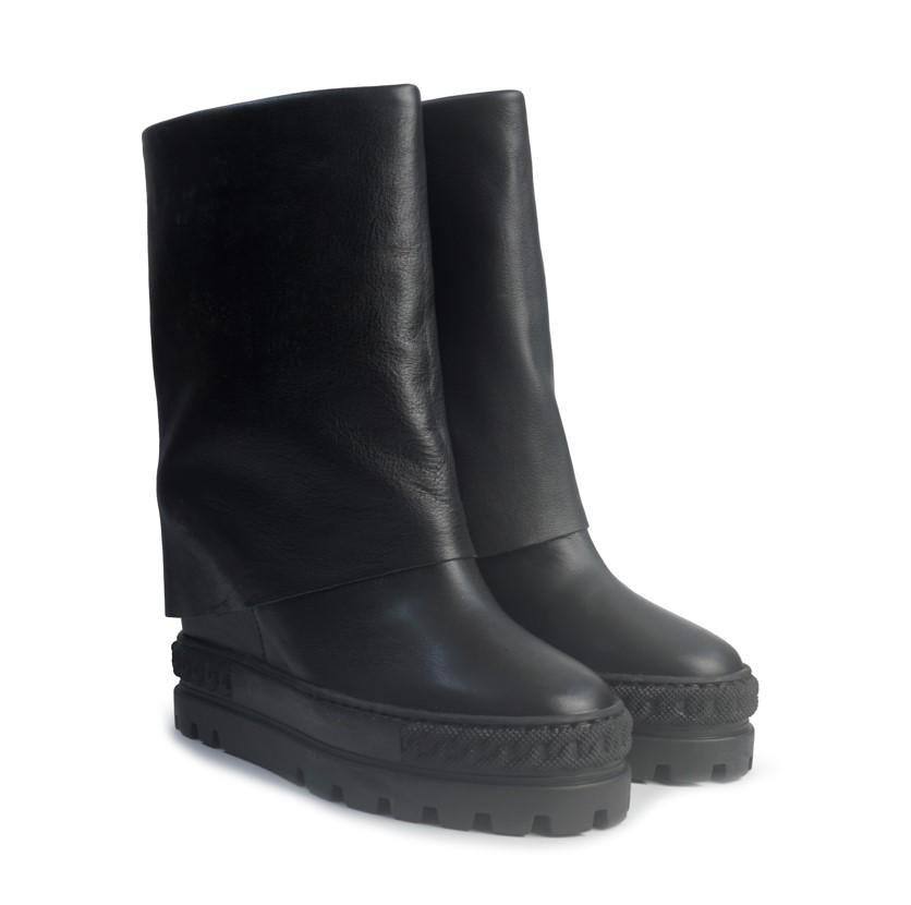 Scopri lo stivale in pelle nera che cambia il tuo look in un istante. Il design double face e il risvolto regolabile ti permettono di personalizzare l'altezza, mentre la zeppa interna da 8 cm slancia la silhouette in modo discreto e confortevole. Un mix perfetto di pelle morbida e fondo antiscivolo per garantirti eleganza e sicurezza in ogni passo, tutto l'inverno.