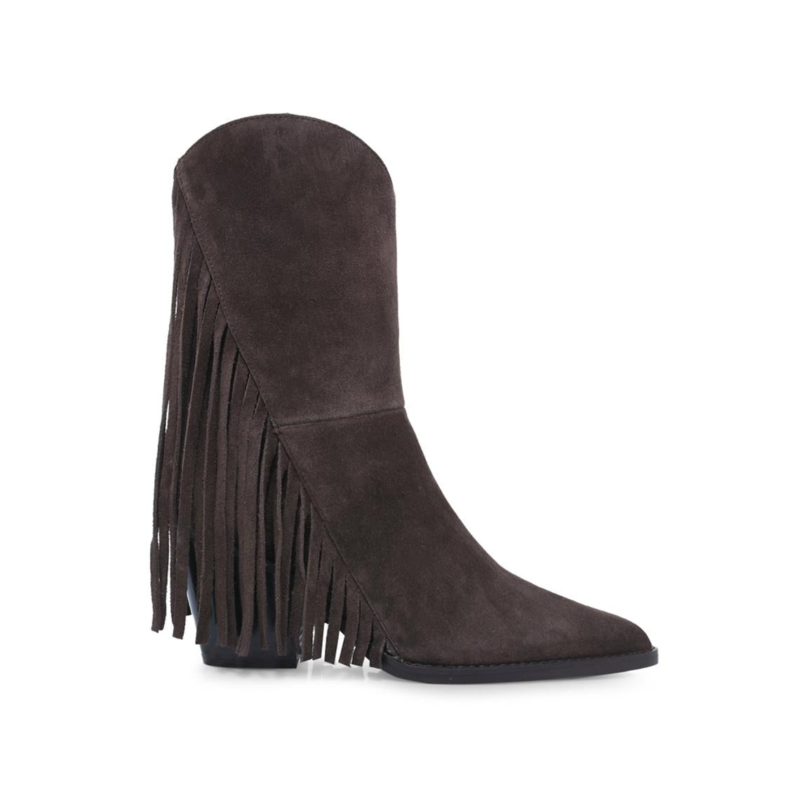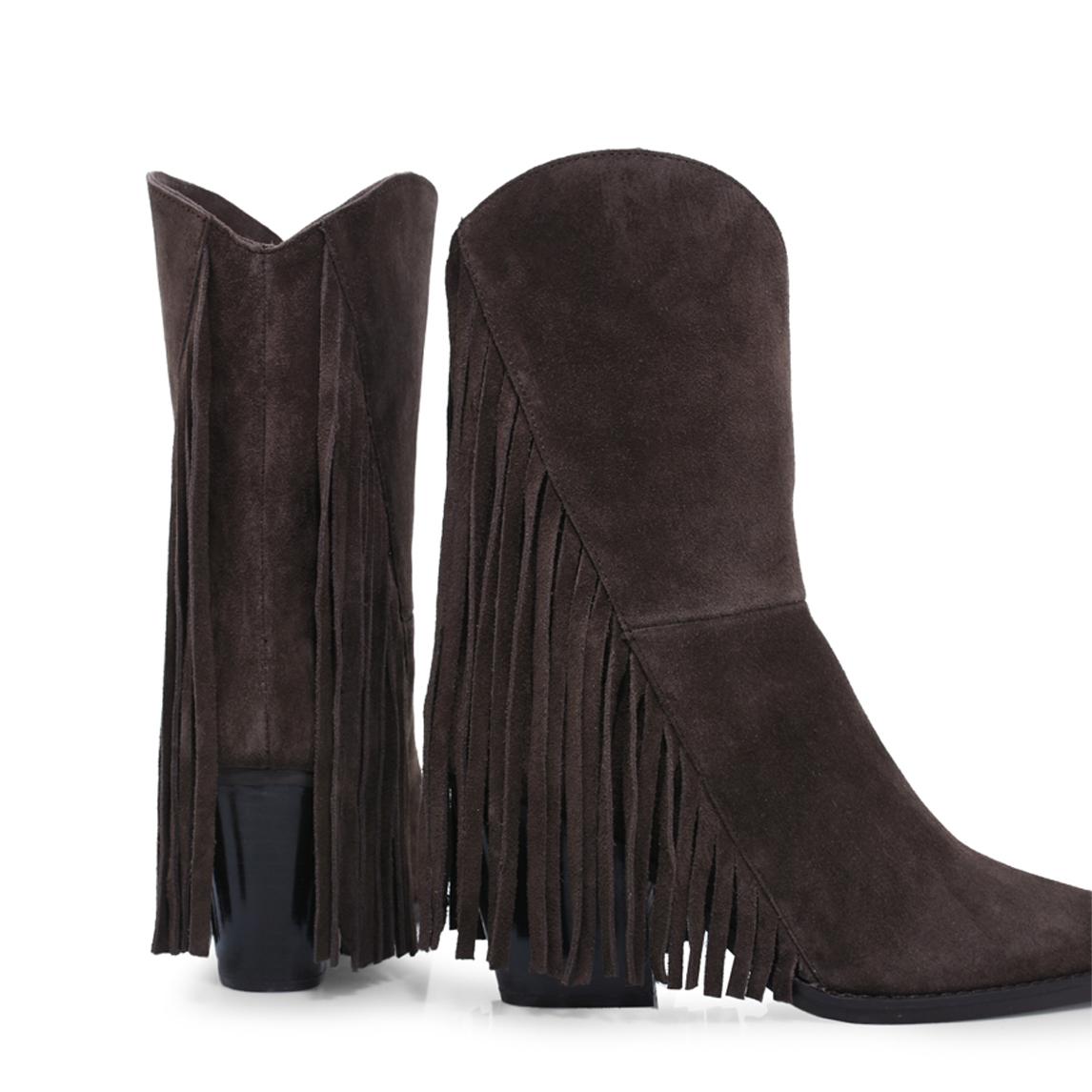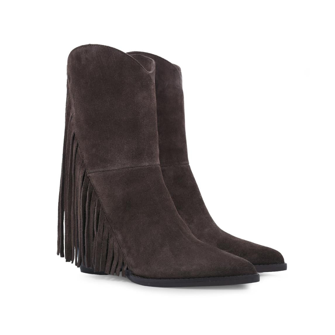 Per un ingresso di spessore con il trend Western, prova questi stivali texani in morbido camoscio moro sono impreziositi da una doppia frangia dinamica che cattura l'attenzione ad ogni movimento.